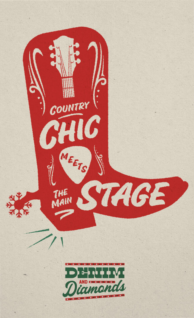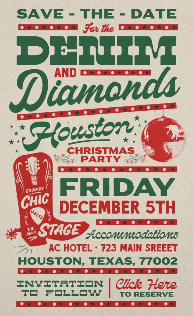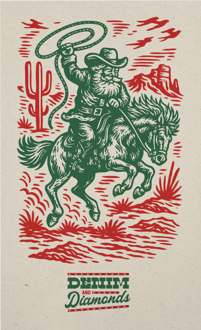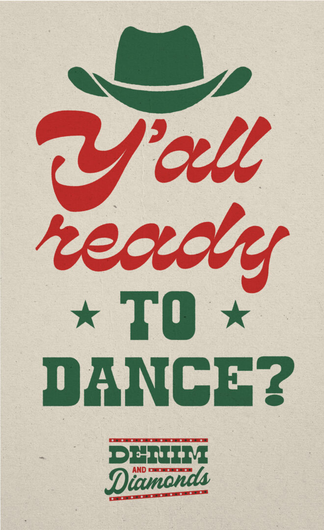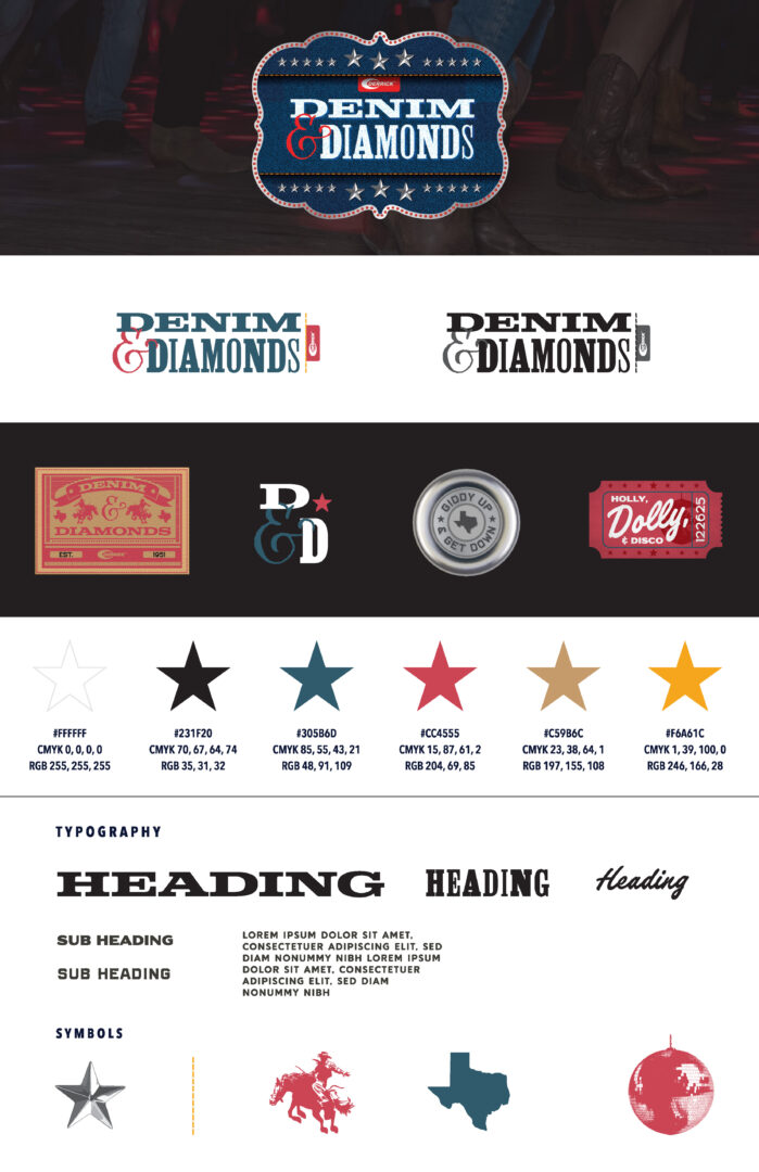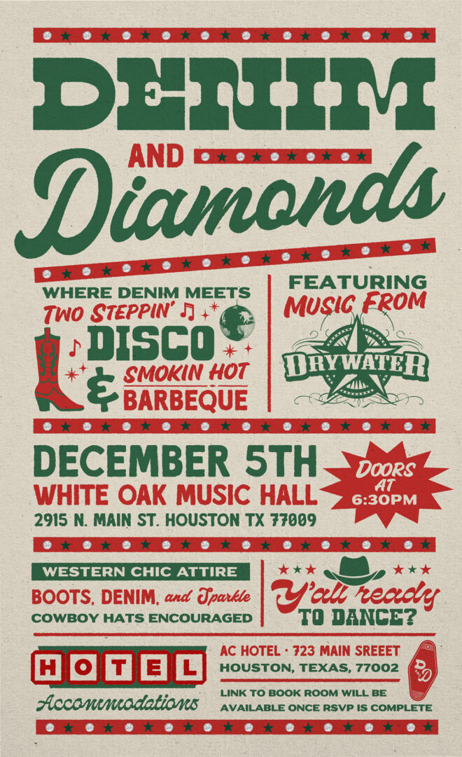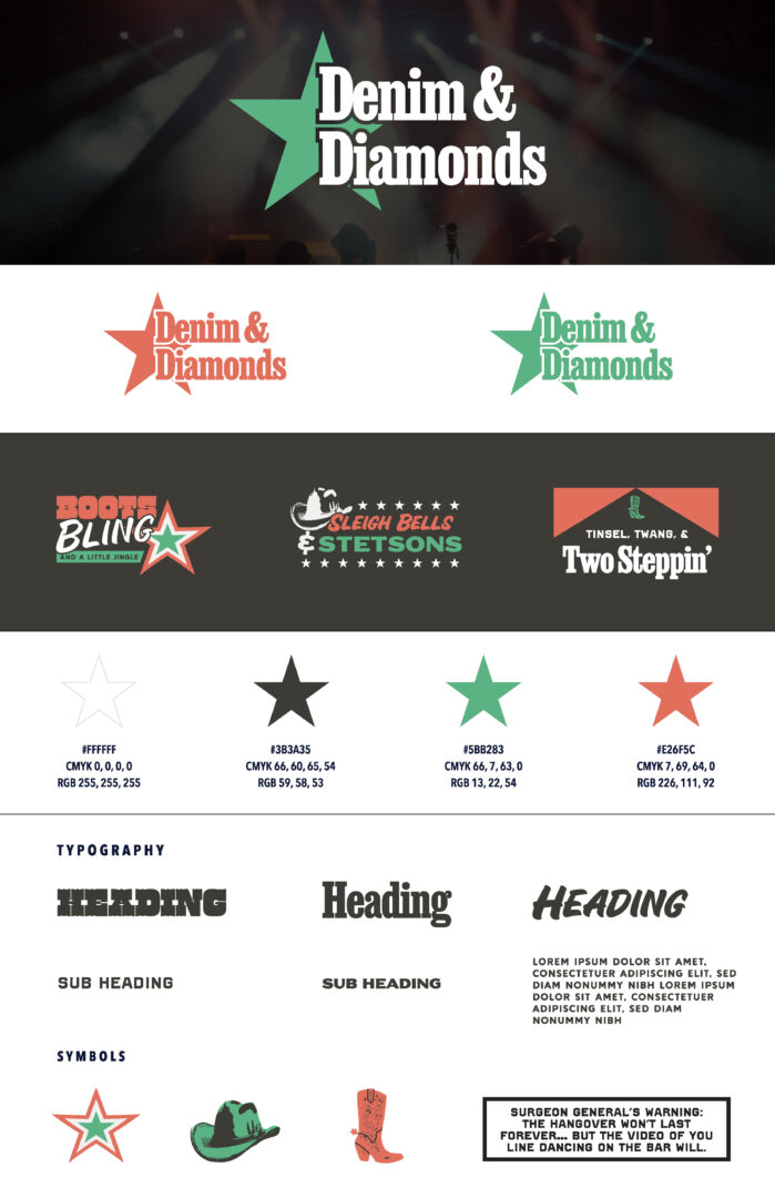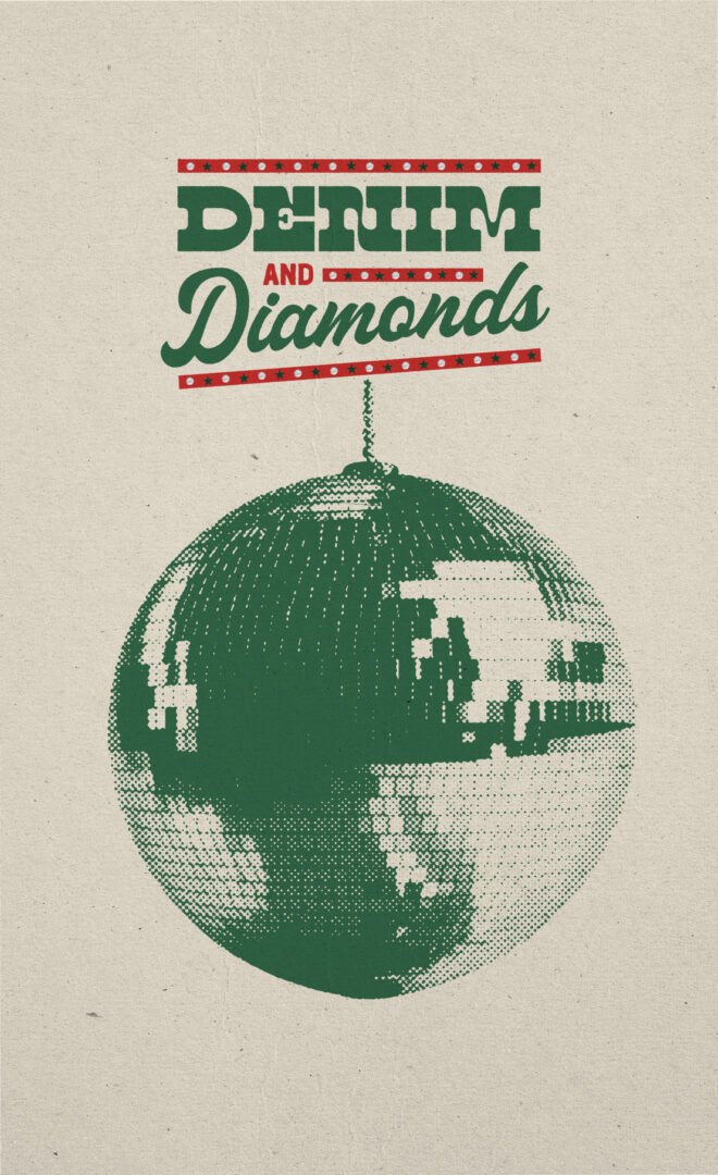 Event branding and visual concept development for a corporate holiday party themed “Denim & Diamonds.” The initial creative direction drew inspiration from a modern western aesthetic, blending a rugged denim feel with a bit of glam, similar to a “Cowboy Carter” style vibe. I developed the visual identity, color palette, and a set of supporting marks used across event materials.